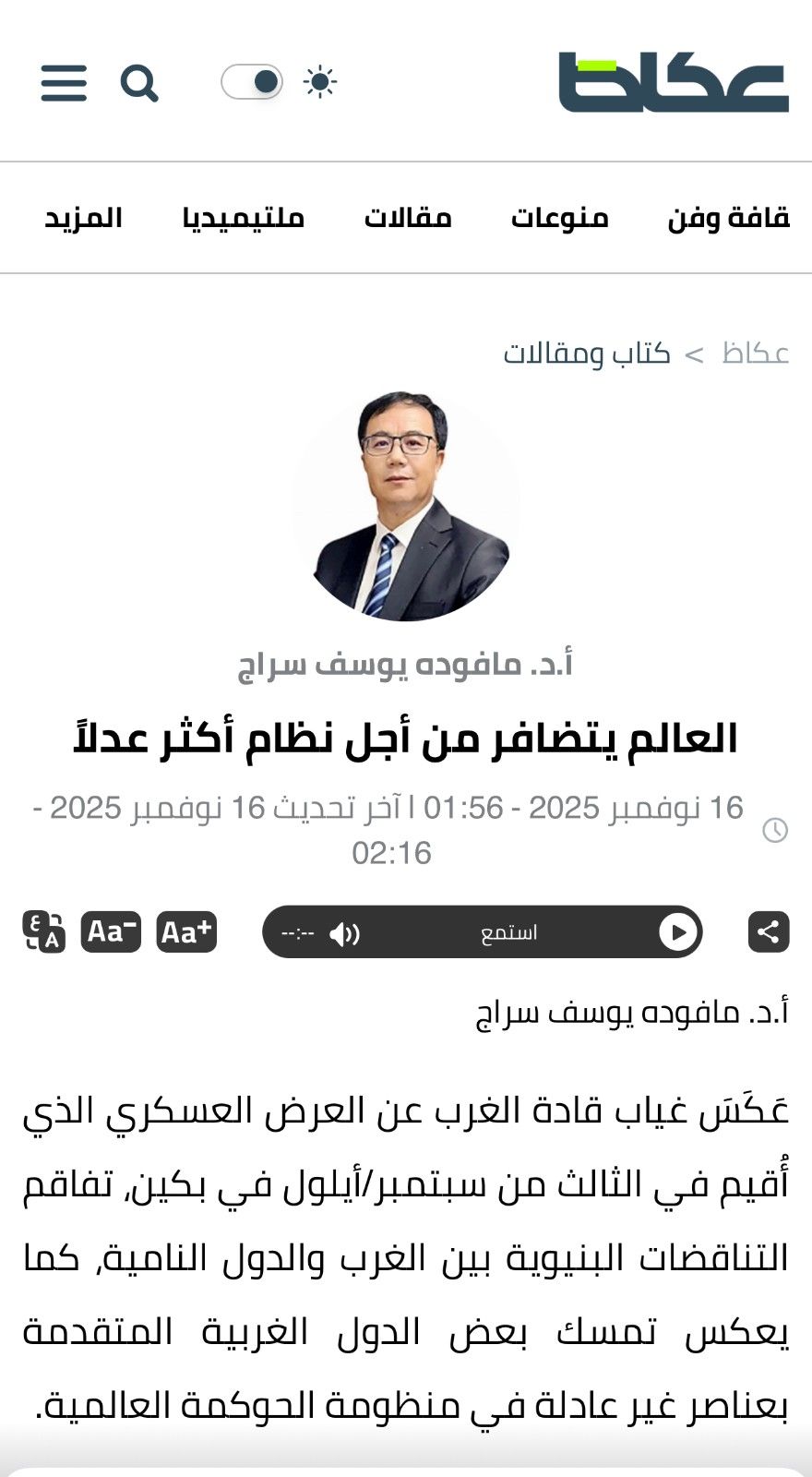 11月16日,沙特阿拉伯最具影响力的媒体之一《欧卡兹报》刊发我校马福德教授撰写的评论文章。文章直面当前部分国家政治霸权主义复辟、强权逻辑蔓延的国际态势,深刻指出一些势力妄图无视二战历史教训的危险倾向,明确阐释中国阅兵式所承载的深层内涵。中国从战争胜利的辉煌与惨痛教训中汲取奋进力量,坚定秉持反对一切形式霸权主义的立场,始终与世界上爱好和平、渴求正义的国家和人民并肩同行,坚决抵制不公正现象,携手共筑人类命运共同体。