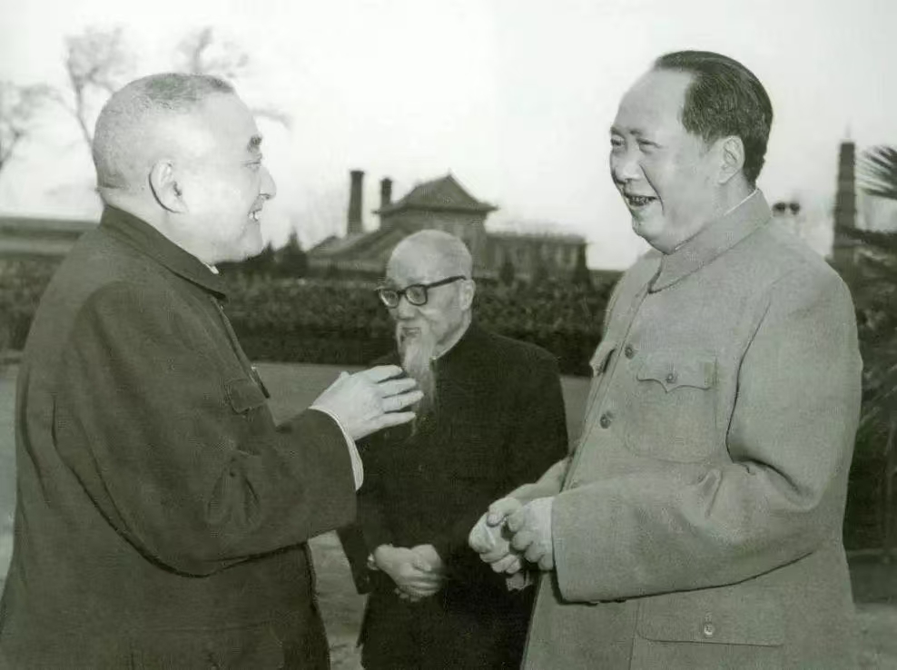 1957年,中共中央主席、国家主席、全国政协名誉主席毛泽东和民建中央主任委员黄炎培亲切交谈,中为全国工商联领导人陈叔通。
