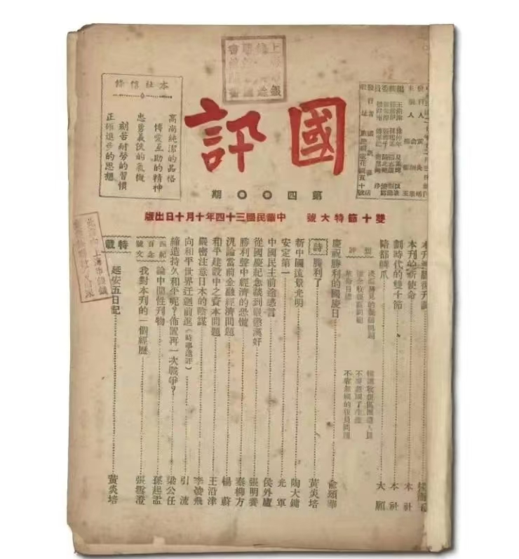 在中国民主党派历史陈列馆的中国民主建国会(以下简称民建)展厅中,有一本泛黄的小册子。这是1945年10月10日出版的第四百期《国讯》。这本由中华职业教育社1931年创办的刊物,彼时刚刚在上海复刊,就推出了“双十节特大号”,其中最重要的内容当属黄炎培的“延安五日记”。