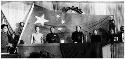 人民政协第一届全体会议在北京召开,毛泽东与宋庆龄等在主席台上。